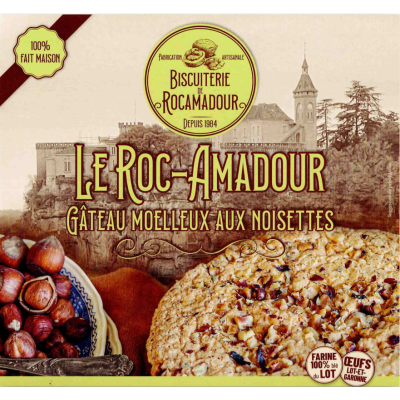 Gâteau moelleux à pâte levée - ingrédients: sucre, oeufs*, noisettes* (25%), beurre*, farine*, poudre à lever* - poids net: 220g